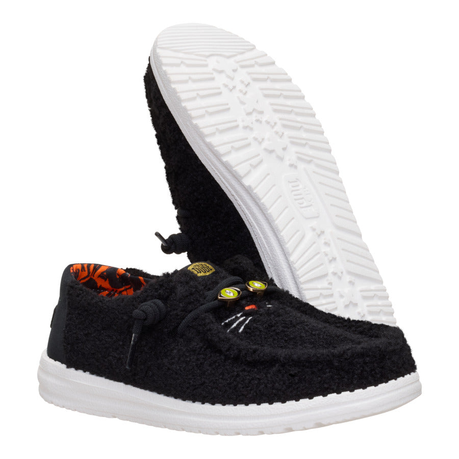 Something purr-fectly spooky this way comes… Meet the Wendy Black Cat, the fluffiest little fright your feet will ever love! Covered in soft, black sherpa and rocking a mischievous cat face (complete with pointy ears and plenty of cattitude), this cozy creature is here to claw its way into your heart—and your closet. With a lightweight feel, slip-on magic, and eerily good comfort, they’re perfect for casting cozy spells, dodging bad luck, or just creeping it real.